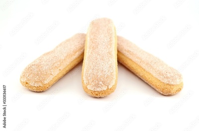 Savoiardi biscuits, also known as Ladyfingers,on white background. They are sweet sponge cookies used also in many desserts