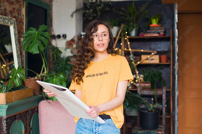 lifestyle portrait of beautiful girl designer with tablet for drawing in her studio