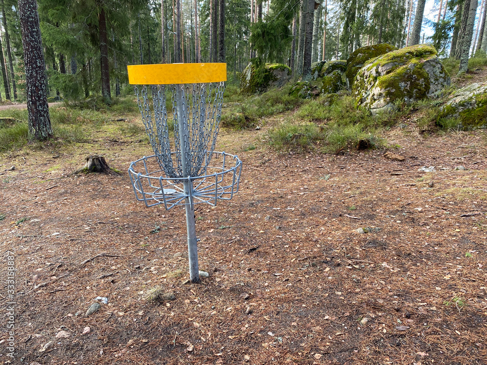 Disk golf basket in forest course
