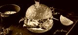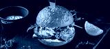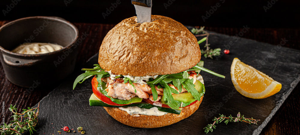 Vegetarian American Cuisine. Burger with red fish salmon, arugula, cucumbers and tomatoes, white sauce. Burger on a black background. background image, copy space text
