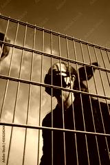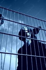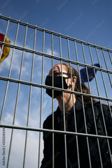 Light-skinned blonde girl in a black protective mask on her face, stands behind the blocking grate, the flag flutters in the background