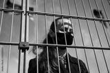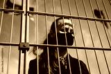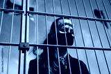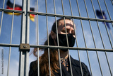 Light-skinned blonde girl in a black protective mask on her face, stands behind the blocking grate, the flag flutters in the background