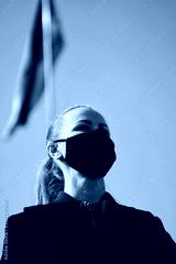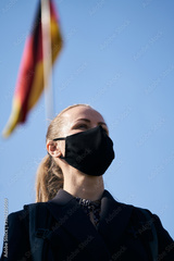 Light-skinned blonde girl in a black protective mask on her face, flag waving in the background