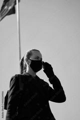 Light-skinned blonde girl in a black protective mask on her face, flag waving in the background