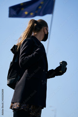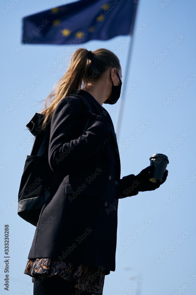 Light-skinned blonde girl in a black protective mask on her face, flag waving in the background