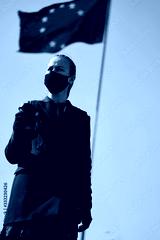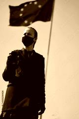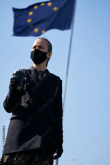 Light-skinned blonde girl in a black protective mask on her face, flag waving in the background