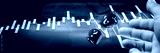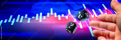 Hand Throwing Two Black Dice With White Question Marks Onto Unstable Stock Market Graph - Financial Decisions Concept
