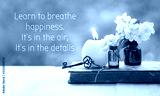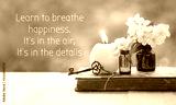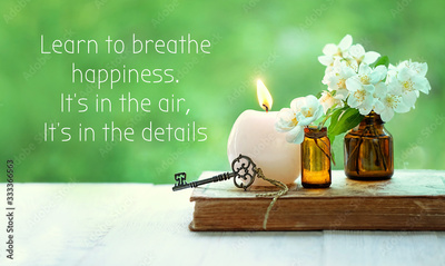 Learn to breathe happiness. It's in the air. It's in the details - inspiration quote. flowers, vintage key, candle and old book. gentle romantic composition