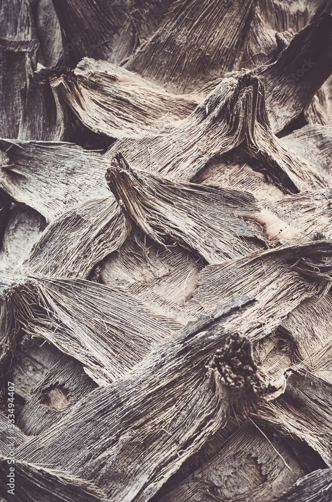 Close up picture of a palm tree trunk, color toned natural abstract background.