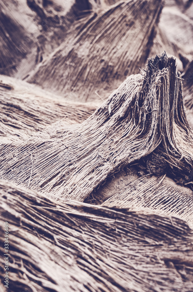 Close up picture of a palm tree trunk, color toned natural abstract background, selective focus.