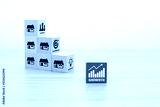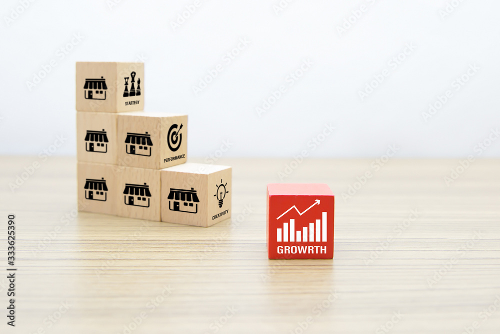 Franchise business,Businessman hand choose reg color wooden toy blog stacked with franchise marketing icons Store.