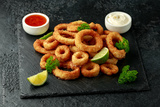 Oven baked breaded calamari rings served with lime wedges, sweet chilli sauce and mayonnaise