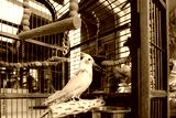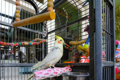 Adult male cockatiel bird seen on his main perch, seen beside his metal mirror. Located in a warm conservatory, seen with his cage door opened.