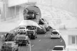 Double exposure of an urban landscape and a man calling on a smartphone