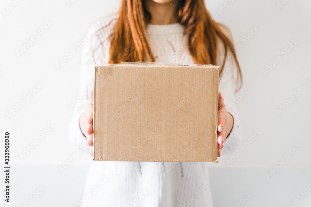 Young woman received the delivery of a cardboard package from a courier - Millennial buys products online - Copy space