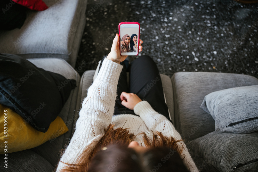 Young woman sitting on sofa video calling her friends with smartphone that live far away from home - Millennials having fun together - Top view