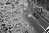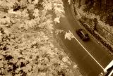 Aerial view of road with red car in beautiful autumn forest. Beautiful landscape with rural road, trees with red and orange leaves. Highway through the park. Top view. Nature background.