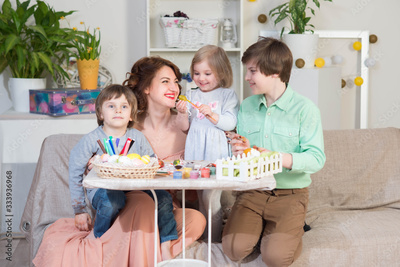 Preparations for Easter celebration with painting eggs and entertaining with family