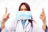 Young female asian doctor inviting patient wear face mask for protecting infected or spreading of viruses, coronavirus, diseases. Medical doctor show protective or medical face mask. white background