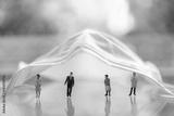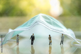 Healthcare, Coronavirus, Covid-19 Protection and Social Distancing Concept. Doctor, nurse, businessman miniature figure people wearing face mask standing under surgical mask