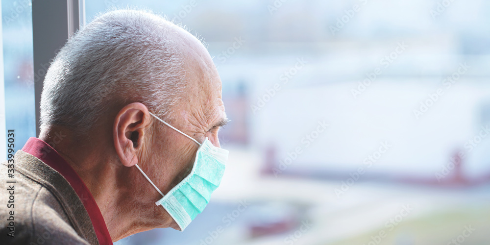 elderly man in protective face mask against virus looks out window stay at home