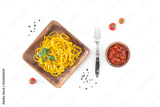 Pasta with tomato sauce and basil. Delicious tagliatelle. Italian tasty food