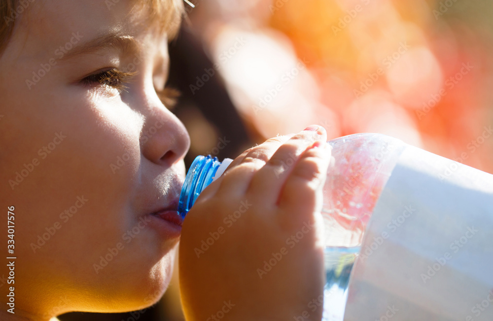 Portrait of a boy with a bottle of mineral water. Boy bottle of water. Young boy holding drink fresh water bottle. A child drinks water from a bottle, baby health. Closeup