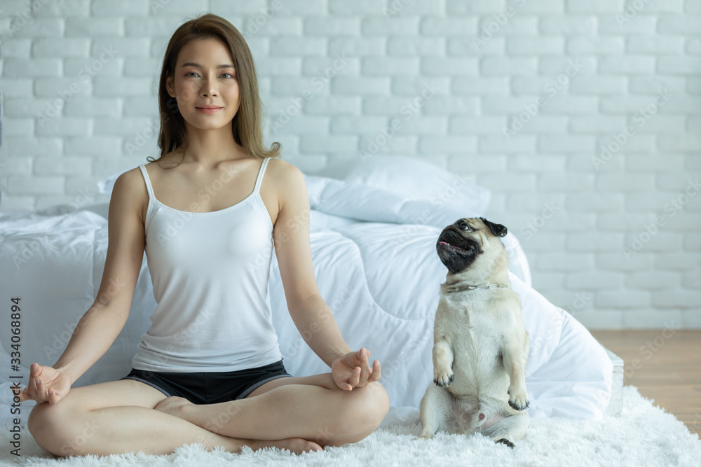 woman practice yoga with dog pug breed enjoy and relax with yoga in bedroom,Recreation with Dog Concept