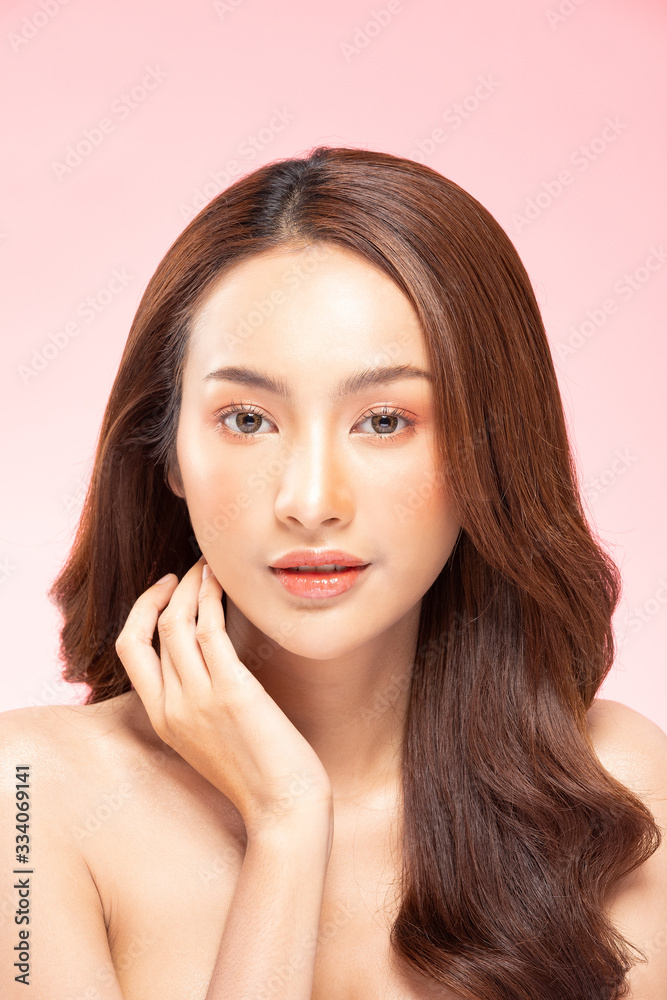 Beautiful Asian woman touching soft cheek smile with clean and fresh skin Happiness and cheerful with positive emotional,isolated on pink background,Beauty Cosmetics and spa Treatment Concept