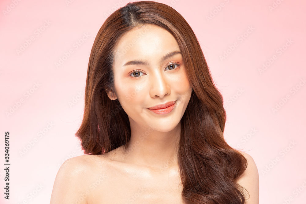Beautiful Asian woman smile with clean and fresh skin Happiness and cheerful with positive emotional,isolated on pink background,Beauty Cosmetics and spa Treatment Concept