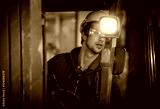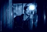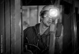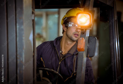 Portrait worker industry factory wear safety uniform factory drive a forklift car and open car light to control production work in factory area for another worker.