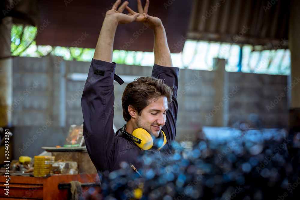 Portrait industry worker wearing uniform and ear phone relaxing at his desk in office at break time after work.