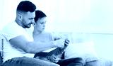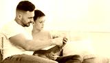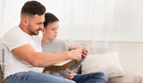 Dad reading book to his son, panorama, free space