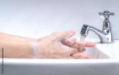 Woman washing hand with soap foam and tap water in bathroom. Hand clean under faucet on sink for personal hygiene to prevent flu and coronavirus. Good procedure of hand wash to kill bacteria, virus.