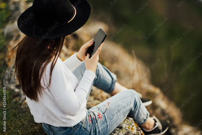 Young stylish traveler on the top of the mountain and going to take picture of her feet by smartphone with scenery landscape. Stylish hipster girl in black hat holding phone. Copy space.