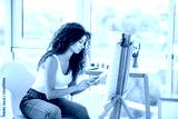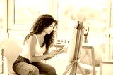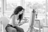 Smiling artist painting on easel