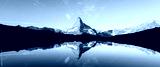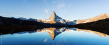 Picturesque landscape with colorful sunrise on Stellisee lake. Snowy Matterhorn Cervino peak with reflection in clear water. Zermatt, Swiss Alps