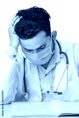 A doctor sits on a chair, looking exhausted and defeated. Their shoulders slump as they gaze downward, one hand resting heavily on their head, conveying deep fatigue and sadness.