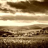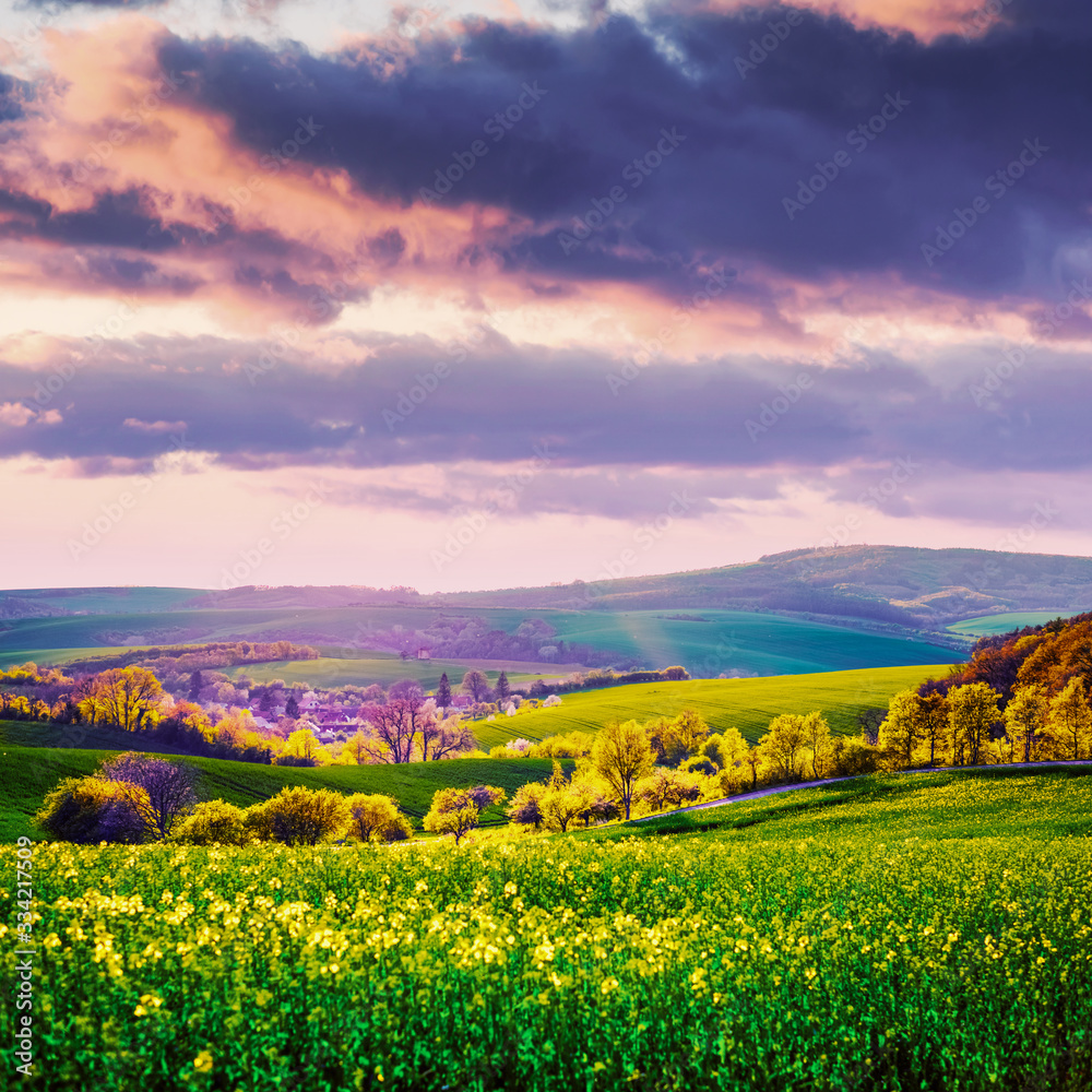 Picturesque rural landscape with green agricultural fields, spring hills and pink sunset sky. South Moravia region, Czech Republic