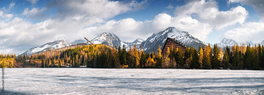Panorama of mountain lake Strbske pleso (Strbske lake) in spring time. High Tatras national park, Slovakia. Landscape photography