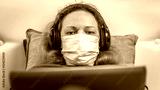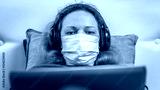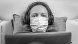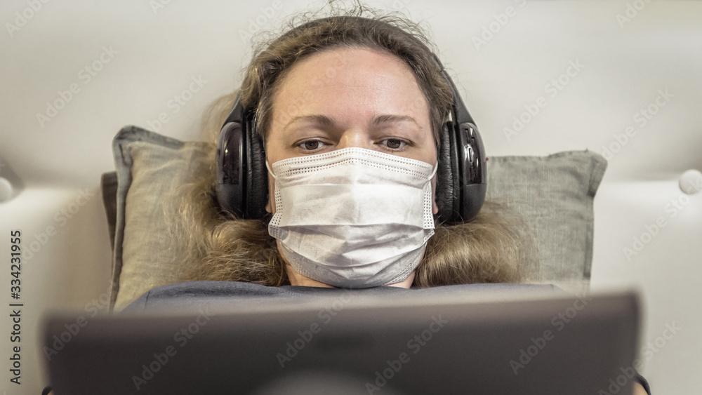 COVID-19 corona virus quarantine concept, woman in mask working with laptop staying home. Person using computer.