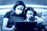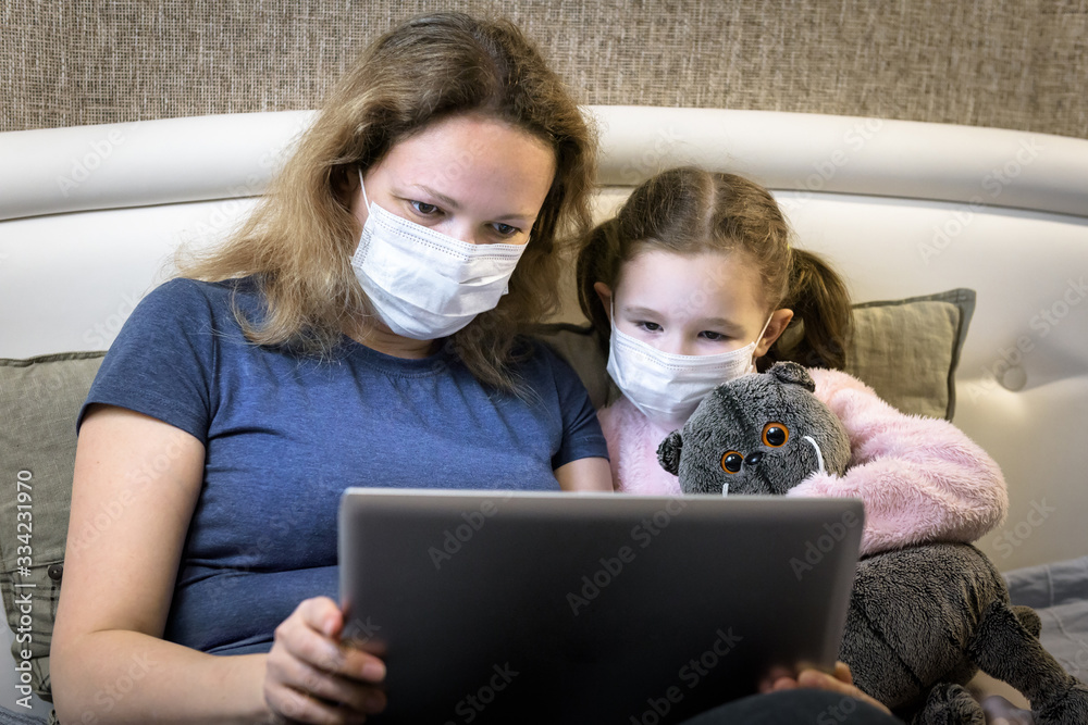 Woman in face mask working with laptop staying home. Family using computer during quarantine. COVID-19 corona virus concept