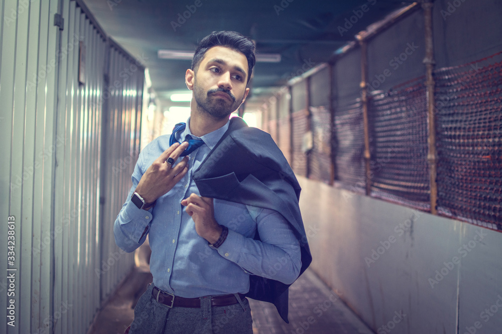 Young businessman in formal wear standing in under construction's area walkway tunnel.