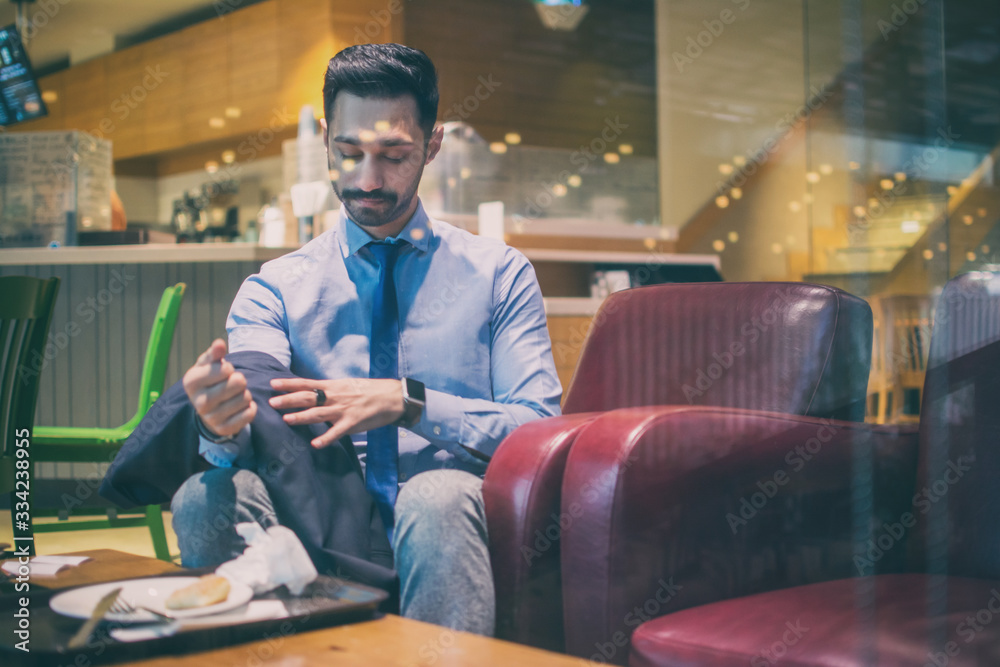 Businessman in formal wear finishing lunch and preparing to leave a cafe.