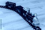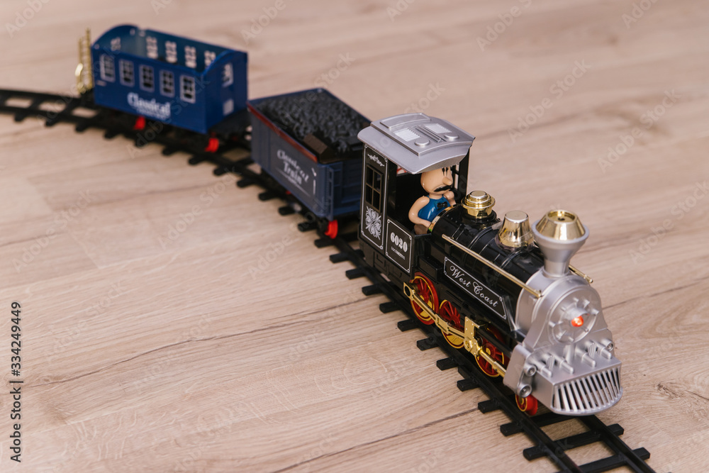 Children's railway. Steam train with cars for the game. There are children's toys on the floor.