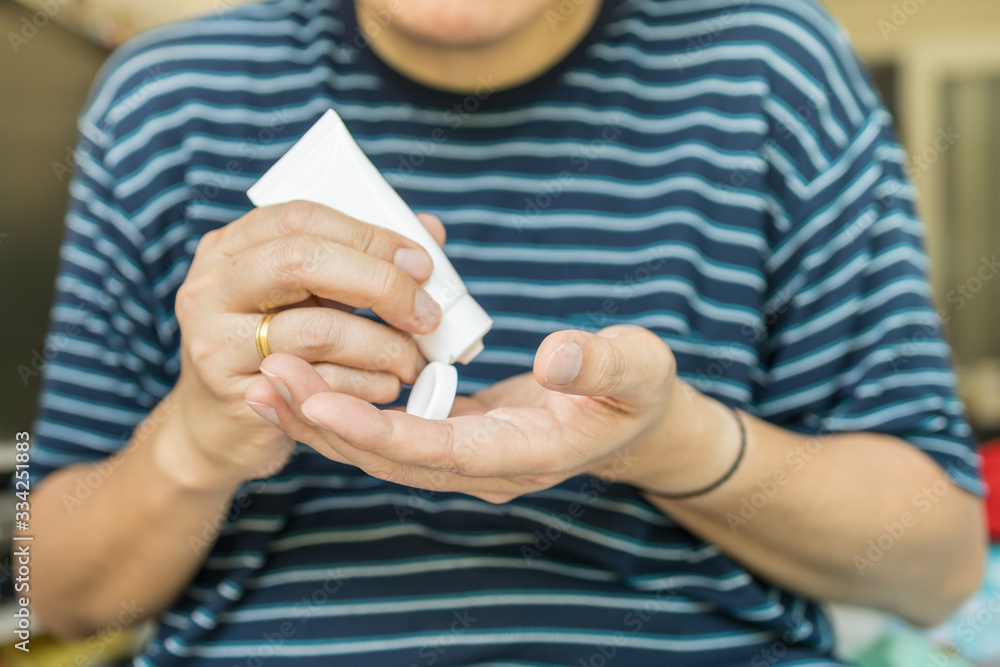 Healthcare, Coronavirus, Covid-19, 2019-ncov Protection Concept. Close up of man hand using alcohol gel sanitizer on hand.