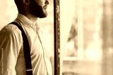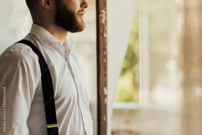 Close up portrait of side view of handsome care fashion man near the window in classic design interior. Close up. Groom on his wedding day, preparing himself for the ceremony next to a window.