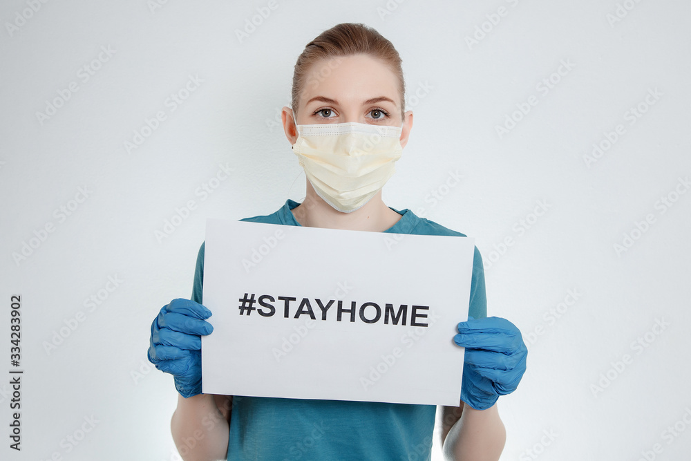 Woman with inscription stayhome. Girl with a poster Covid-19. Woman in quarantine