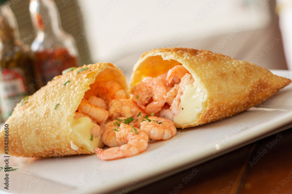 Pastel da culinária brasileira de camarão e requeijão bem recheado encima de prato branco de louça
