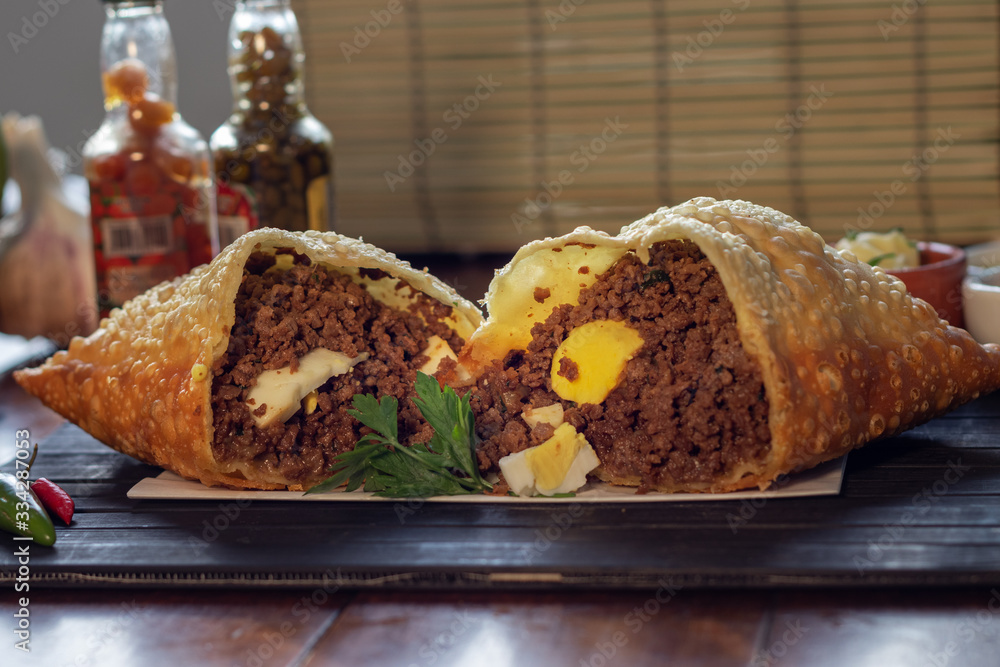 Pastel de carne na mesa de um restaurante com molho de pimenta no fundo decorado